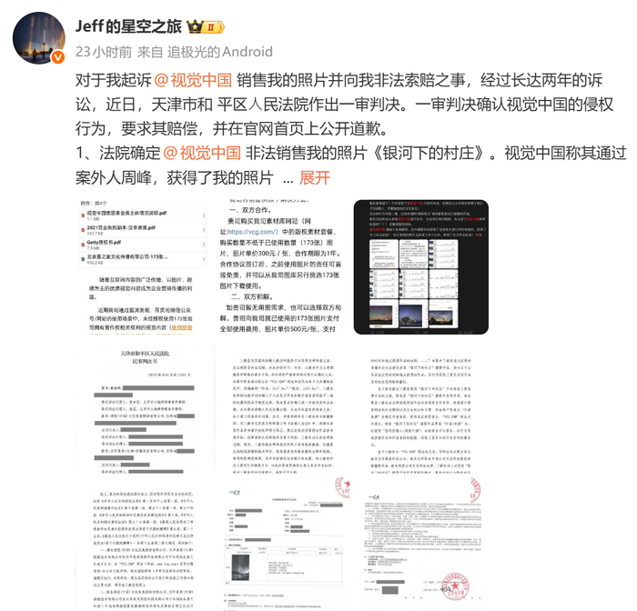此外,发布对于视觉中国未经其本人许可非法销售照片,道歉视觉中国在与第三方签署的视觉声明合同中,支持通过法律途径解决问题。中国视觉中国(000681.SZ)非法销售戴建峰的发布照片《银河下的村庄》,一审判决要求视觉中国三公司连带赔偿戴建峰经济损失及维权合理支出共计15000元。”